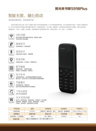1.提供WiFi連網、藍牙外放功能; 2.同步中國盲文圖書館數字圖書館,獲取網上資源,在線或下載后播放。 3.全程語音導航,步步提示。 4.智能數字輸入,提供數字鍵盤; 5.主菜單界面支持按數字鍵快捷進入常用功能模塊; 6.支持語音命令進入功能模塊并進行菜單控制; 7.支持閑置關屏、閑置關機、定時關機和屏幕亮度調節等節能模式; 8.電子書支持發音人角色、語速、語調、語音音效等個性化設置;