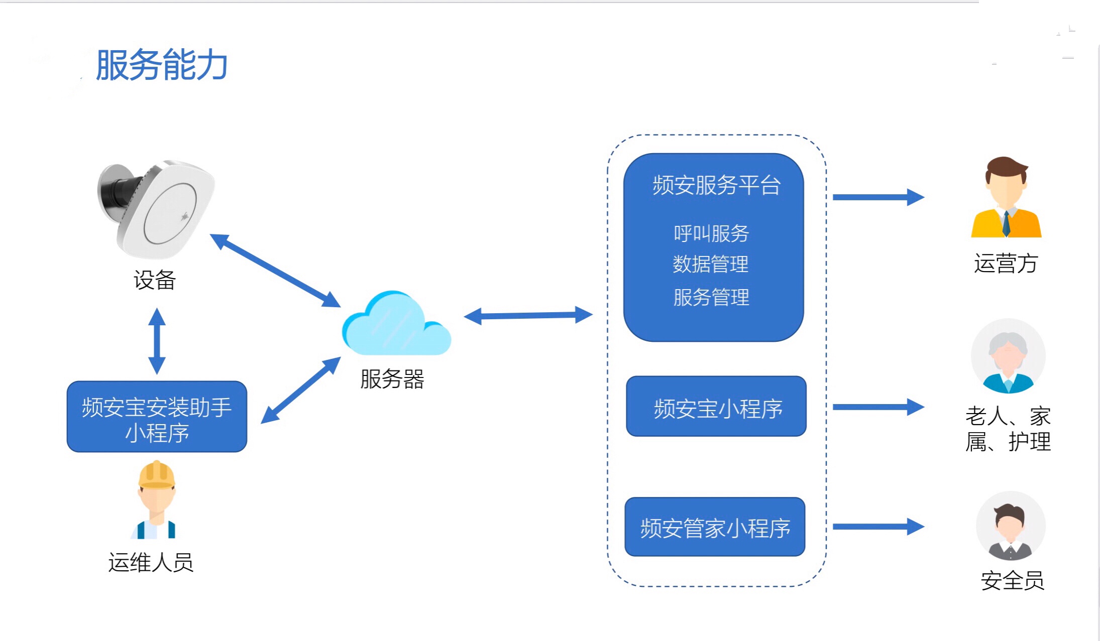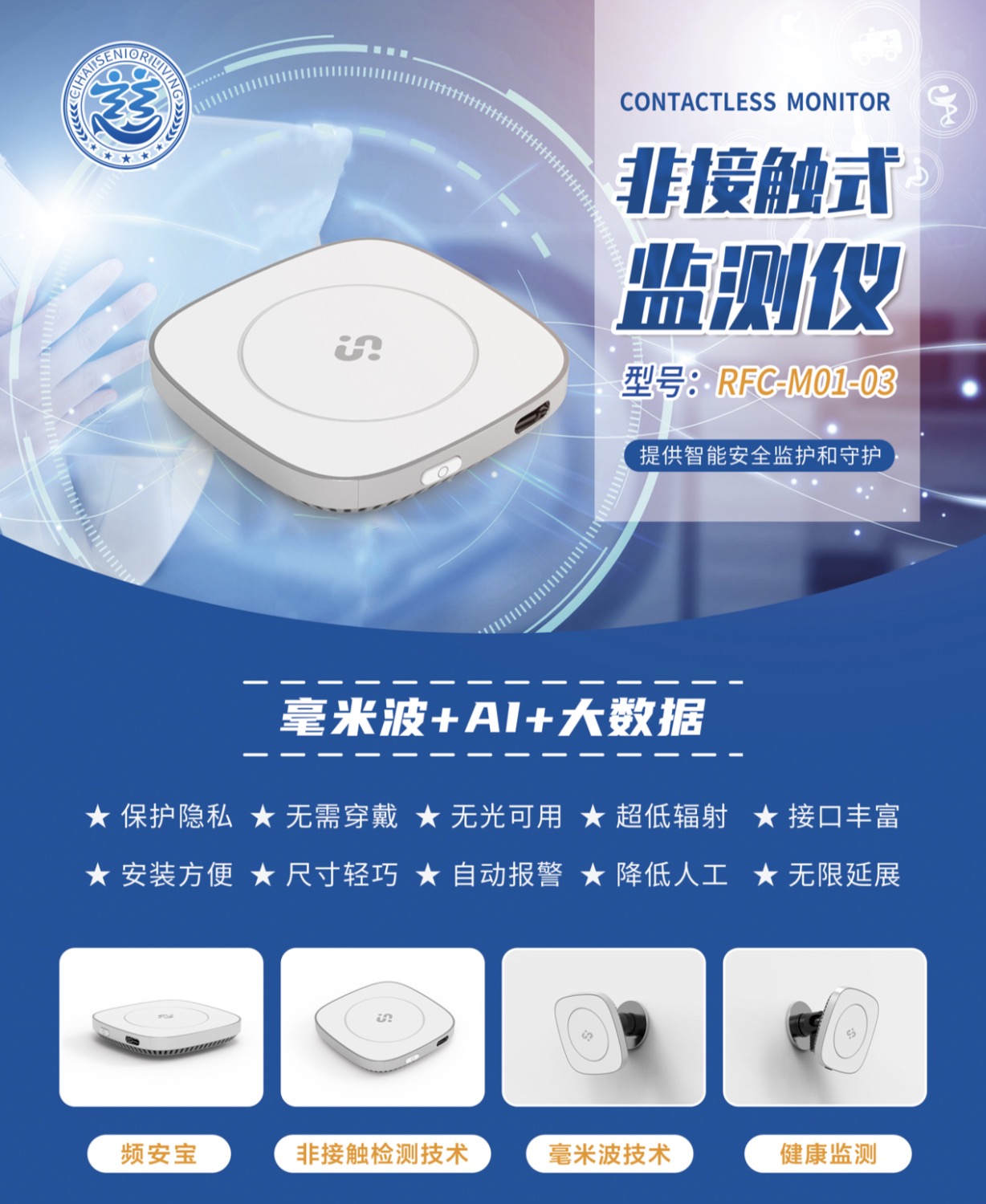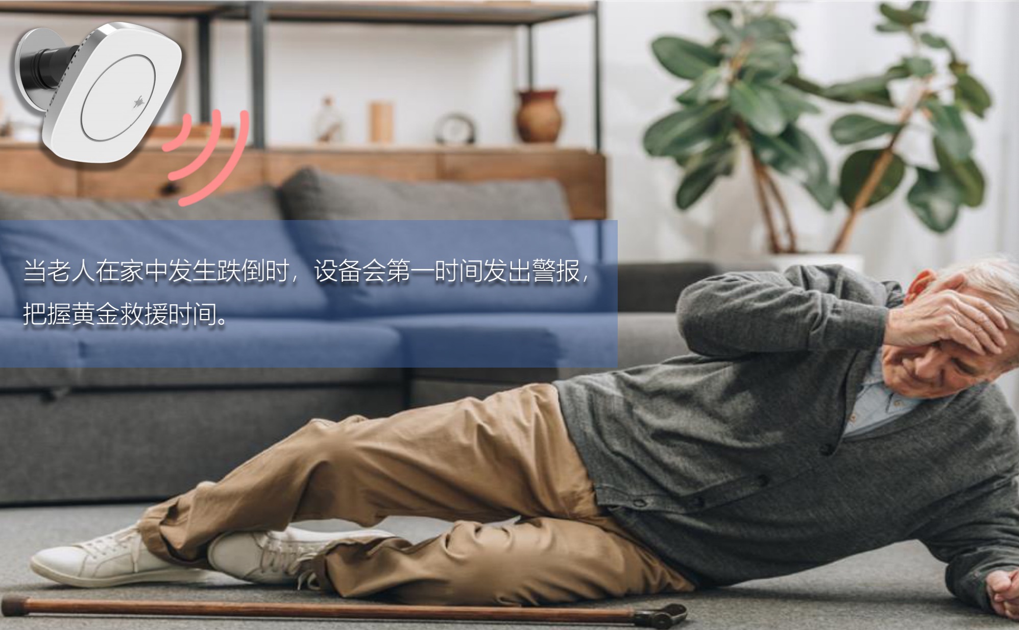 無感知監護設備,通過向空中發射無線電波,使用人工智能算法將反射回來信號翻譯成,呼吸、心跳、位置、體征、體態等信息,不需要老年人穿戴任何設備,便可以實時進行摔倒、墜床、呼吸暫停、癲癇等安全監測。 由于是非視覺技術,不存在隱私問題,可以對被監護人實現真正的7X24小時連續不斷監測,包括洗手間、洗澡間和臥室場所,完整記錄所有日常生活信息,使得我們不僅可以做到“事后警報“,還可以做到”事前預警“。