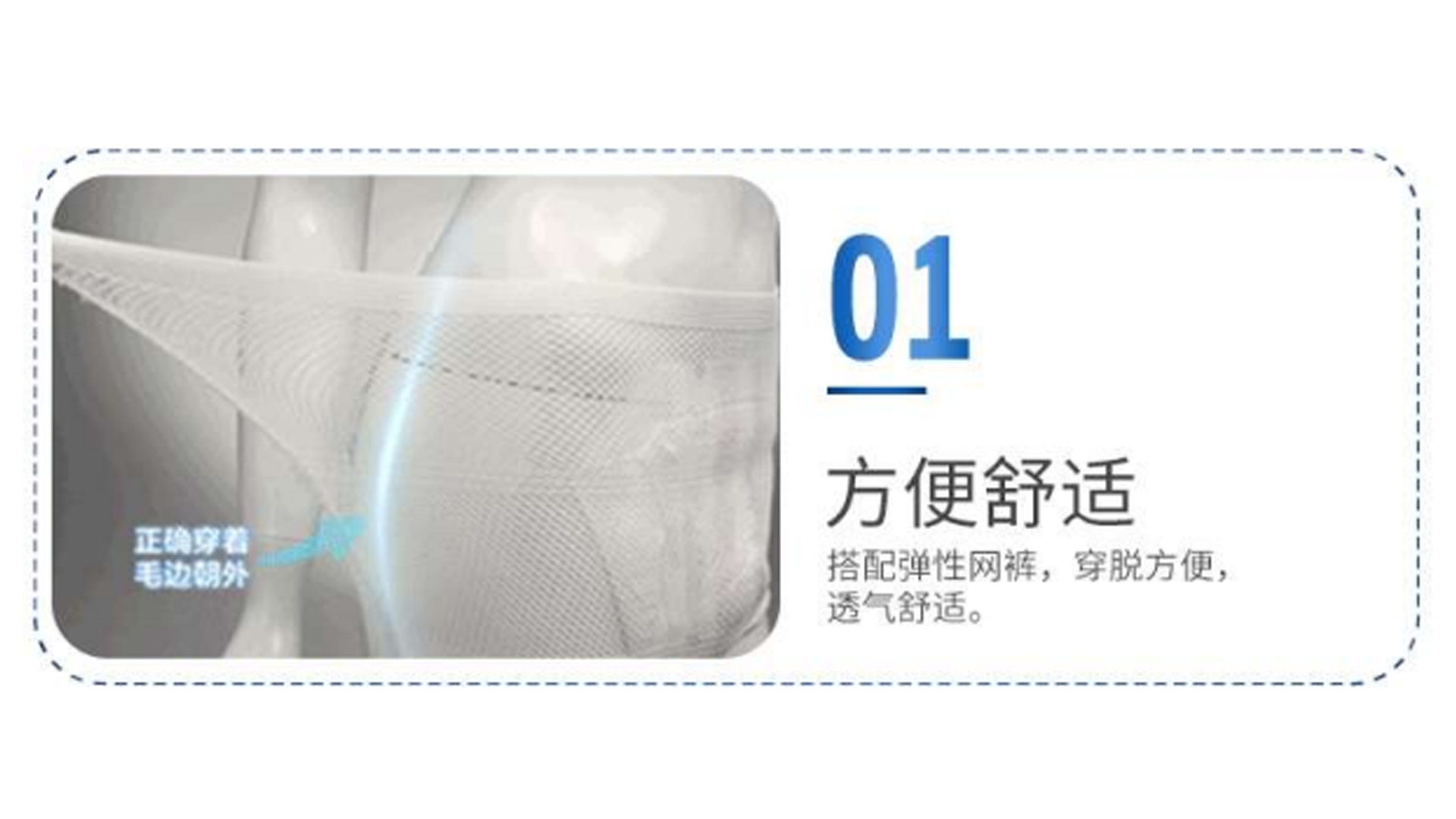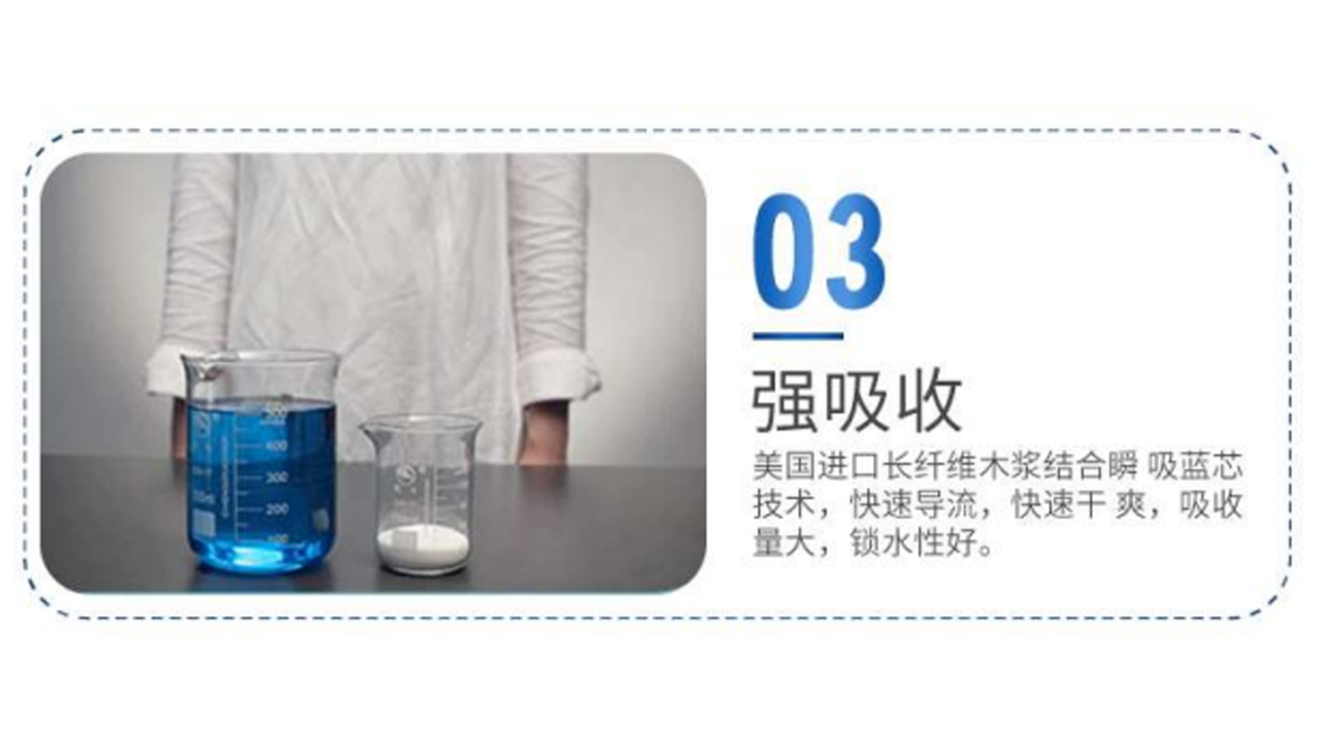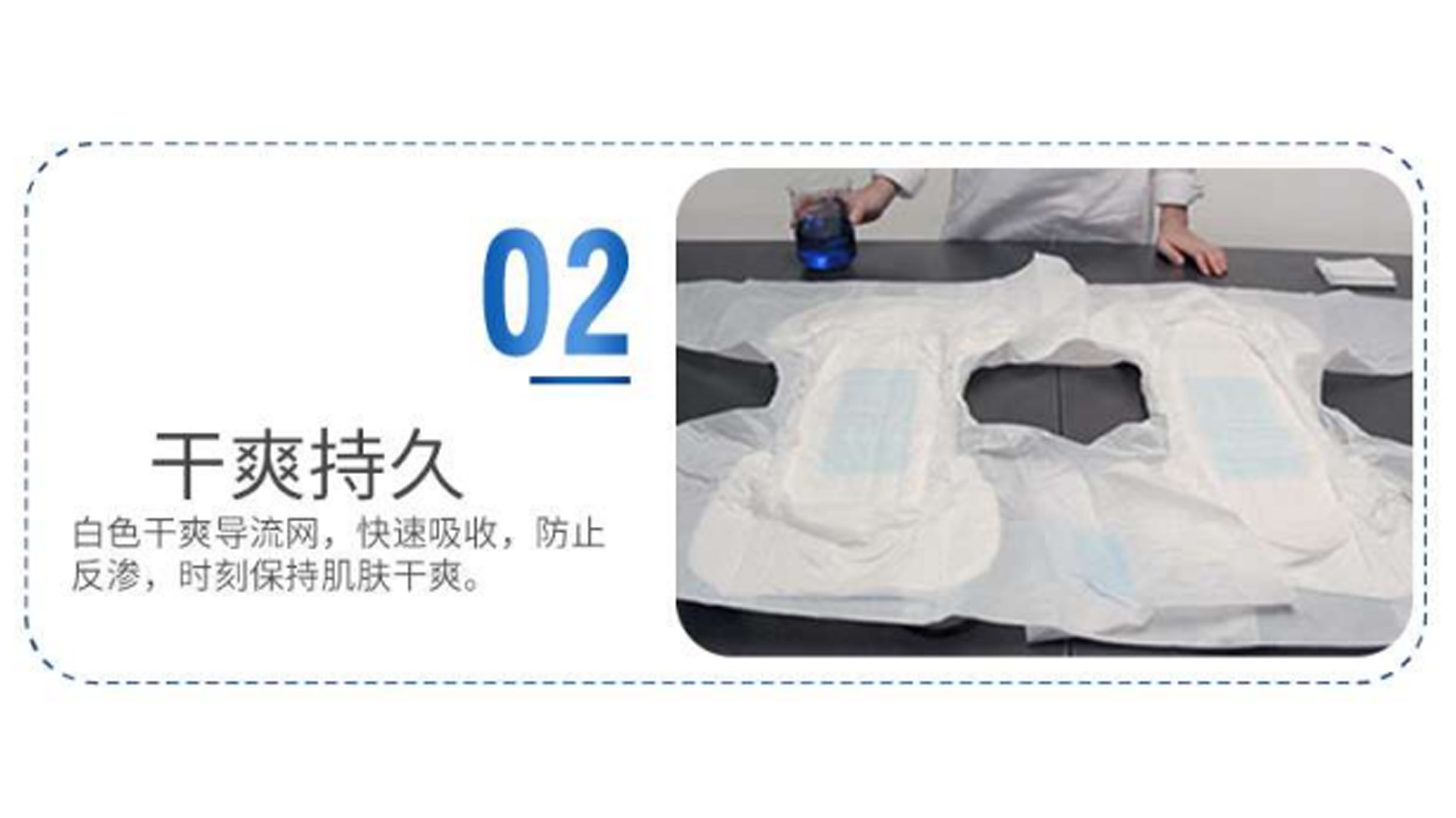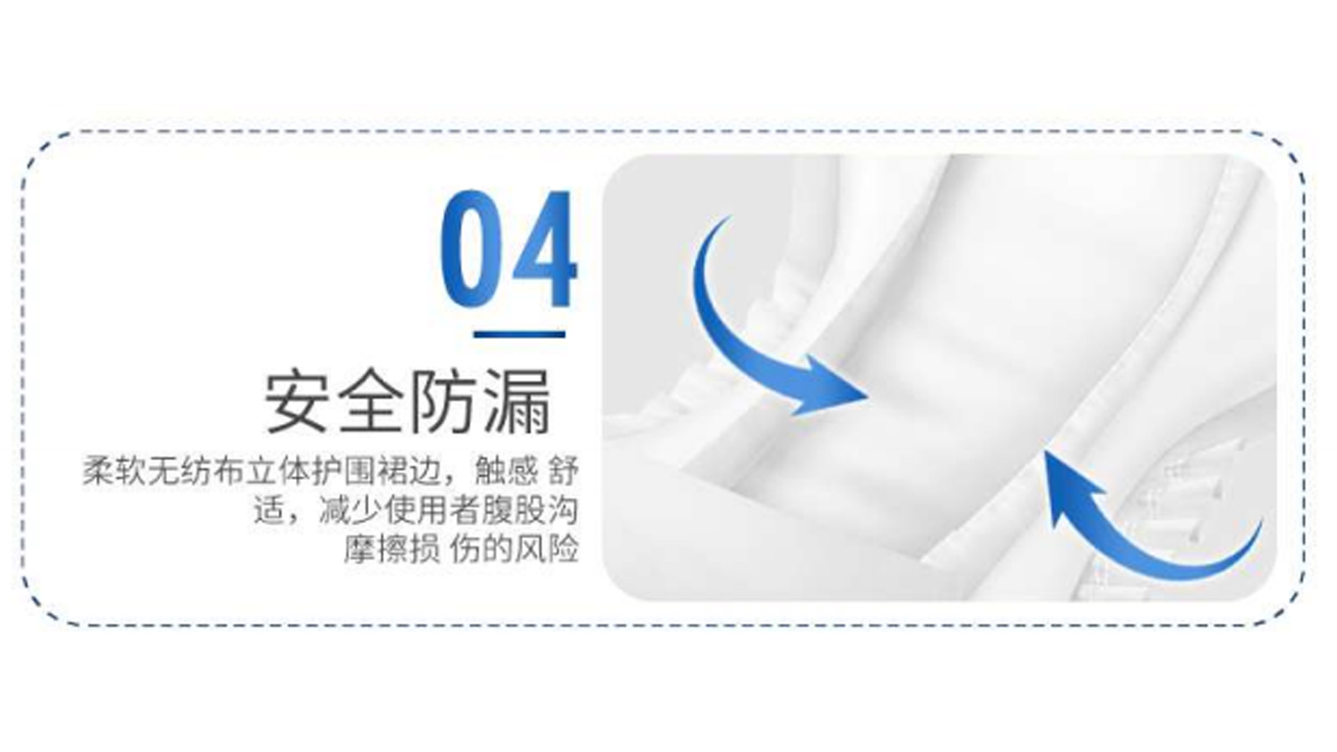 獨特8字型設計 前小后大的“8”字型設計,更貼合人體曲線,后尾加寬 多面吸收不怕漏 白色導流層 速吸干爽,吸收量大,鎖水性好 表層干爽舒適 祛異味高分子 可有效控制使用時產生的異味(中和氨氣 ) 高效祛異味 親膚表層柔軟貼身 采用優質親水無紡布,綿柔材質 舒適貼身,更好的呵護表層肌膚健康 立體防漏隔邊 減少使用者腹股溝摩擦損傷的風險 有效防止尿液和稀便側漏