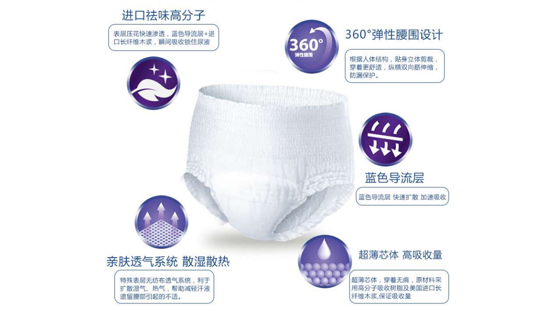 根據人體結構,30°柔軟腰圍剪裁,穿著舒適,縱橫雙向橡筋伸縮,更多防漏保護。特殊表層無紡布透氣系統,利于擴散濕氣、熱氣,幫主減輕汗液遺留要不引起的不適。柔軟無紡布立體防漏裙邊,觸感舒適,減少使用者腹股溝摩擦損傷的風險,有效防止測漏。采用全新除臭型SAP,可有效控制使用時產生的異味,凈化居住環境,有效保護個人隱私。