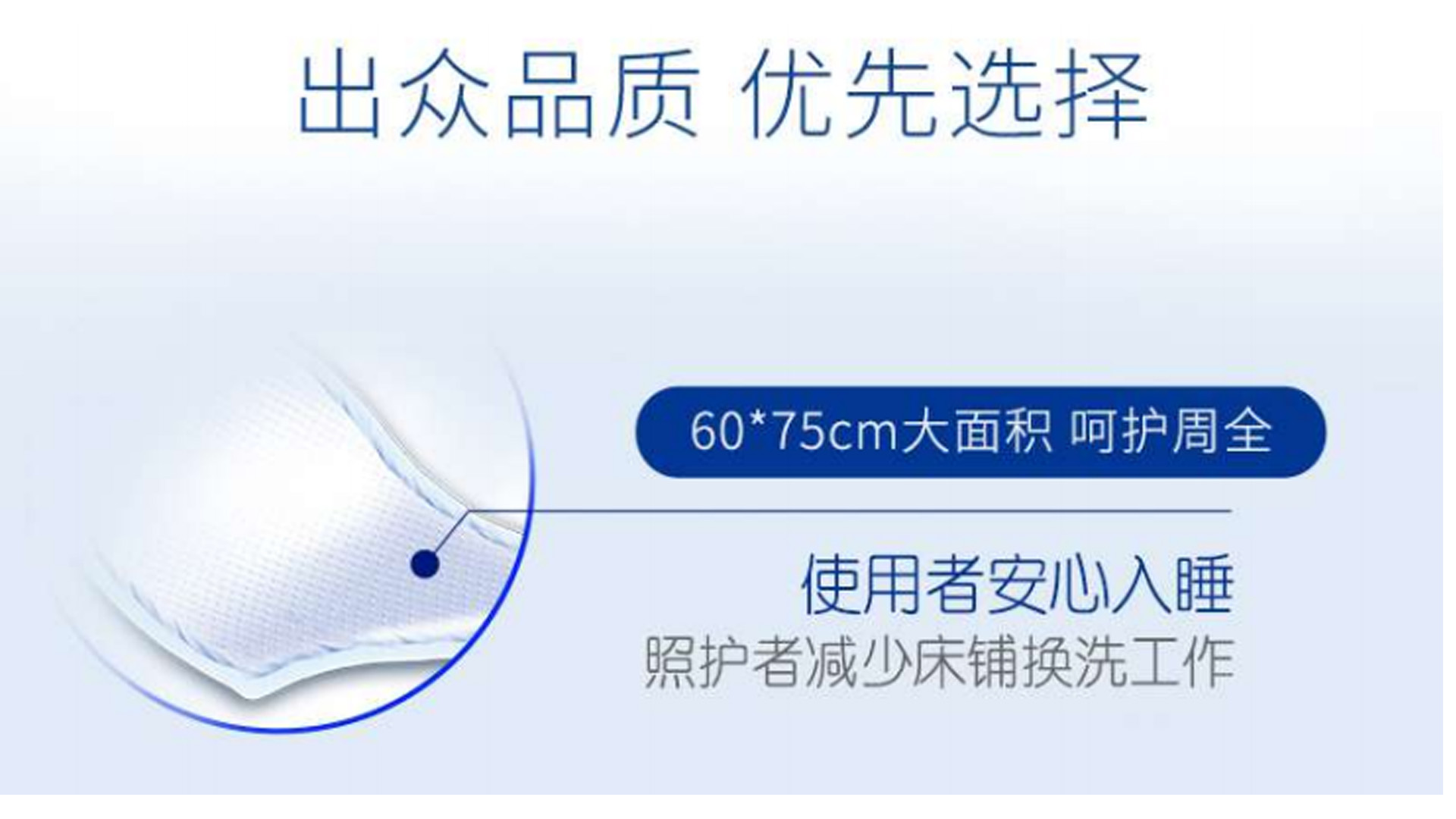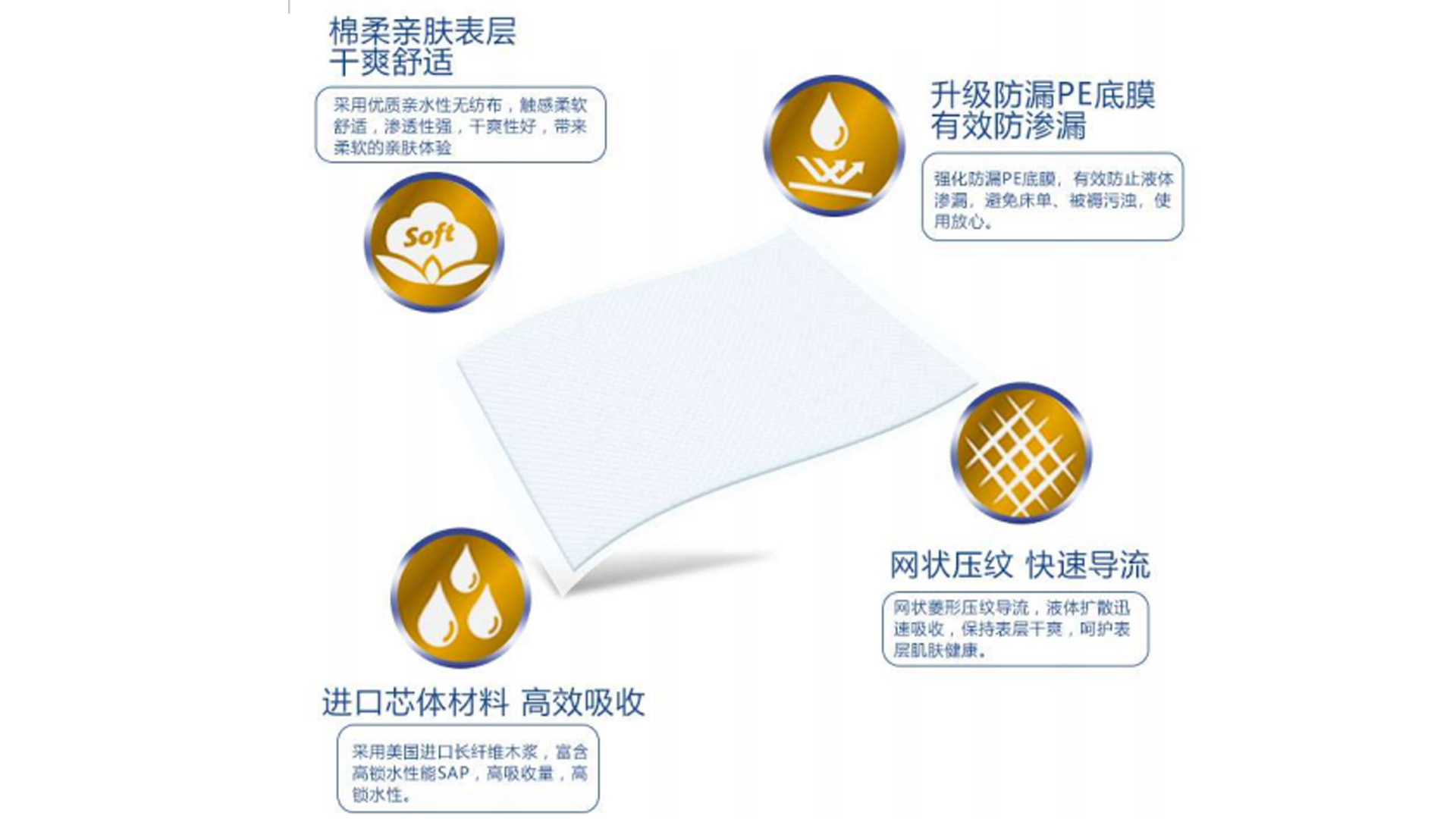 柔軟表層 采用柔軟親水無紡布,觸感舒適,滲透性強,干爽性好 高速擴散壓紋 網狀菱形壓紋導流設計,液體擴散迅速,維持表層干爽。 高分子 有效防止滲漏,減少床單,被褥污濁的換洗次數。 防漏PE底膜 有效防止滲漏,減少床單,被褥污濁的換洗次數。