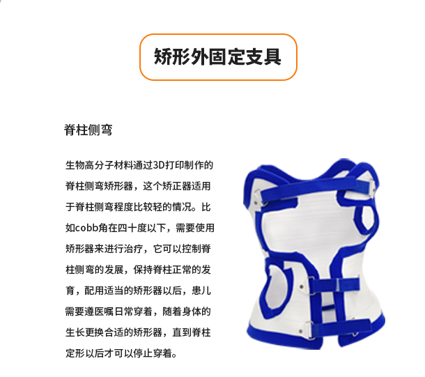 矯形外固定支具 脊柱側彎 生物高分子材料通過3D打印制作的脊柱側彎矯形器,這個矯正器適用于脊柱側彎程度比較輕的情況。比如cobb角在四十度以下,需要使用矯形器來進行治療,它可以控制脊柱側彎的發展,保持脊柱正常的發育,配用適當的矯形器以后,患兒需要遵醫囑日常穿著,隨著身體的生長更換合適的矯形器,直到脊柱定形以后才可以停止穿著。