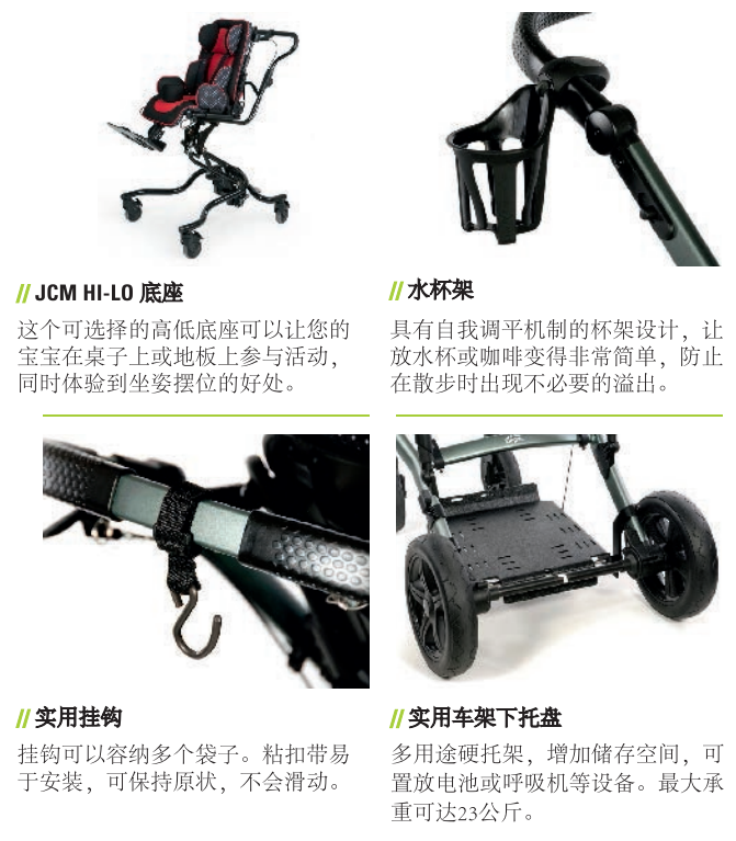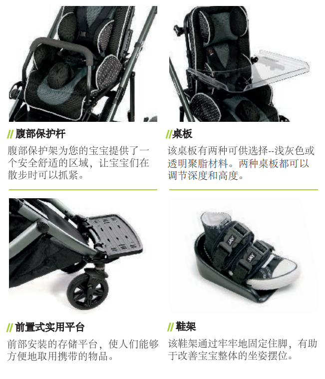 頭部支撐,骨盆帶,胸帶,分腿器,腳踏板,傾斜角度,靠背高度,軀干側向支撐高度寬度,髖關節支撐高度寬度均可調節,為寶寶提供最貼心的保護。