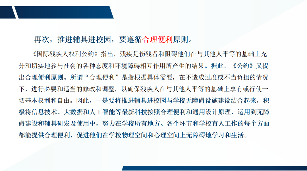 王紅霞校長作《“輔具進校園”工作的北京海淀經驗》主題發言,對北京海淀相關工作經驗予以了總結和可復制性分享。她指出,輔具要滿足不同障礙類型特殊學生的需求,要通過提供支持,改善功能;要通過促進參與,提質增效;要尊重差異,體現價值;要增加互動,促進融合。她強調,輔具進校園要遵循個別化的理念,提供適宜的資源支持。她展望,輔具能夠更加智慧化、系統化和多樣化,加強輔具資源的開發與利用,切實尊重學生的差異,支持所有學生最大限度融入集體,提升學習與生活質量,讓所有學生同等有尊嚴地享受人生出彩的機會!