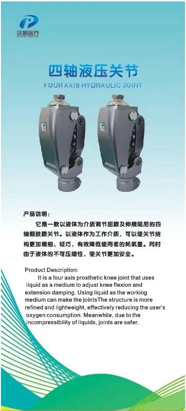 它是一款以液體為介質調節屈膝及伸展阻尼的四軸假肢膝關節。以液體作為工作介質,可以使關節結構更加精細、輕巧,有效降低使用者的耗氣量。同時由于液體的不可壓縮性,使關節更加安全。