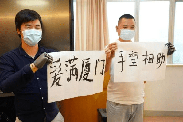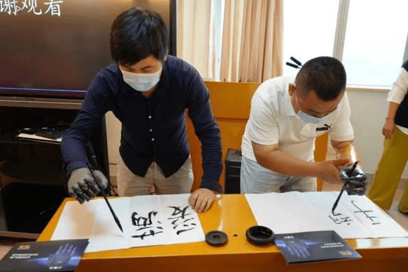 活動現場,幾位殘疾人朋友佩戴BrainCo強腦科技智能仿生手,手握毛筆寫下“愛滿廈門”、“手望相助”等字