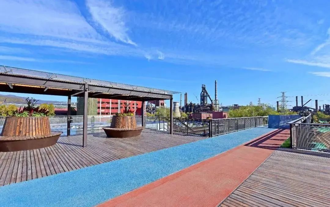 從老舊工業園轉身,只為未來休閑、商業兩相宜的可持續發展與宜居生活要素。高線公園是首鋼園區“地下-地面-空中”三級立體慢行系統的重要組成部分。其中,群明湖北側的空中步道長約670米,通過水體景觀和現有的管廊的結合設置雙層平臺。步道西部順接永定河濱河休閑公園,整體打造京西綠色生態健康廊道。