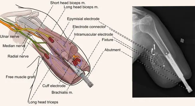 研究團隊在對一位手臂截肢患者進行了手術。他們將新的顯微外科技術與復雜的植入電極相結合,這些電極提供對假肢的單手指控制以及感覺反饋。其中,電極和骨整合接口分別提供與假體的電氣和機械連接。