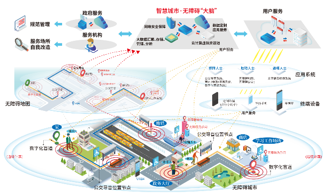 為輪椅、視障、聾啞人士定制的無障礙地圖,連接公交、出租等資源,提供數字化盲道、無障礙公共交通,構成無障礙服務平臺,有效破除了不同類別殘障人士出行難、溝通難、融入難的問題。