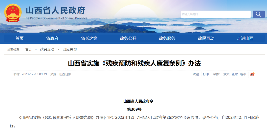 山西省實施《殘疾預防和殘疾人康復條例》辦法2月1日起施行
