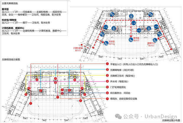 通過使用者視角的帶入,設計師在建筑內部嘗試構建連貫的無障礙流線(圖 9),連接各功能空間和無障礙設施,保證通行寬度和連續性,確保安全性和所有空間、設施可達易用。