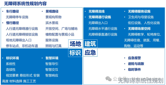包容性校園規劃基于通行設施、服務設施、信息交流設施三大系統,從場地、建筑、標識、應急 4 個層面,形成完整的無障礙體系(圖 3)。