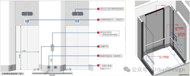 “創新核“建筑群內部客梯共計 8 組 11 部 ,提高標準全部設置為無障礙電梯(圖 12),方便所有人使用,避免區別對待。電梯口采用八字口,轉角進行圓角設計,避免磕碰危險。候梯廳設置低位呼梯按鈕、提示盲道、運行顯示裝置等,并增設腳踏按鈕。轎廂內設置低位操作盤、盲文按鍵、三面扶手、鏡面材質、報層音響、聲光顯示裝置等。