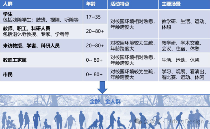 包容性校園的服務對象不再是少數殘障或運動損傷學生,而是擴展到全體在校師生及工作人員,以及來往于校園的專家學者、研究人員及普通市民,即面向全體社會成員,年齡覆蓋全齡(圖 1)。因此,校園環境在解決殘障群體需求的基礎上,在空間規劃和設施供給中,需要考慮校園內各類人群學習、工作、生活需求及不同的體能特征和認知能力,提供多種可供選擇的通行、使用、交互和服務的方式。