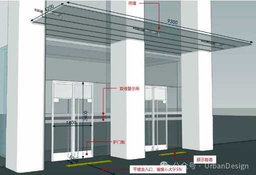 “創新核”主要出入口均為無障礙出入口(圖 11),并結合場地環境,采用坡度小于 5%的平坡出入口,形成便捷通暢的室內外無障礙連通。出入口上方設置雨棚,外開門滿足單扇開啟時輪椅通行寬度要求,玻璃設置雙線提示帶,門斗滿足門扇開啟后的輪椅空間。