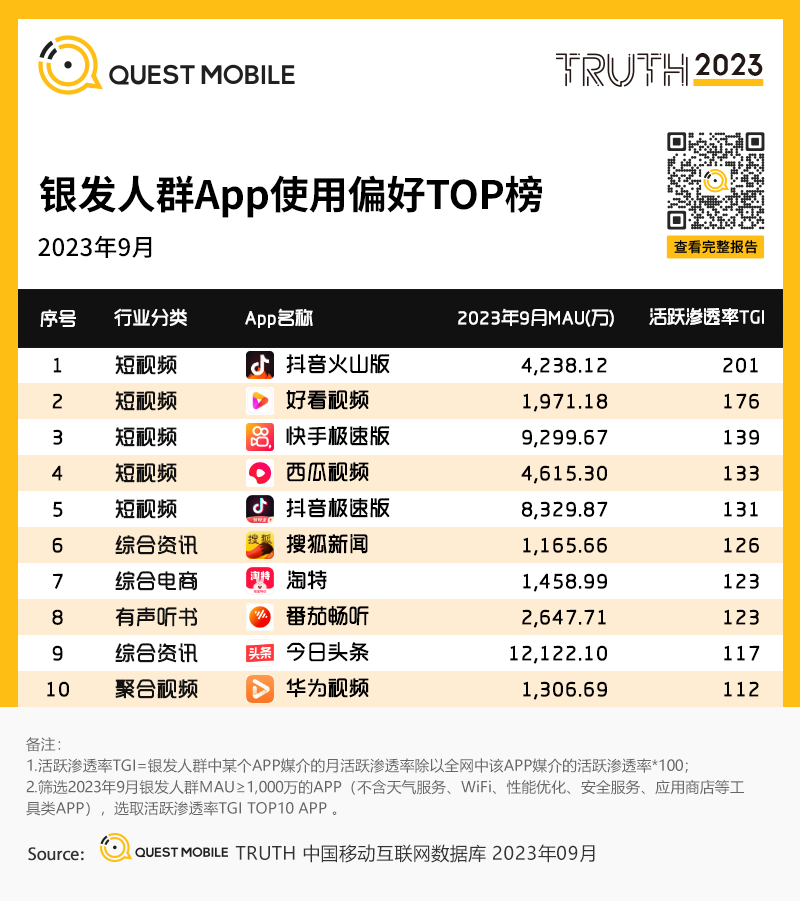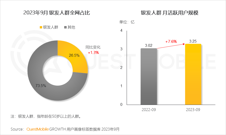 1、作為移動互聯網流量增長的重點群體之一,銀發人群用戶規模已達3.25億,較上年增長超過2,300萬,全網占比提升1.3個百分點。