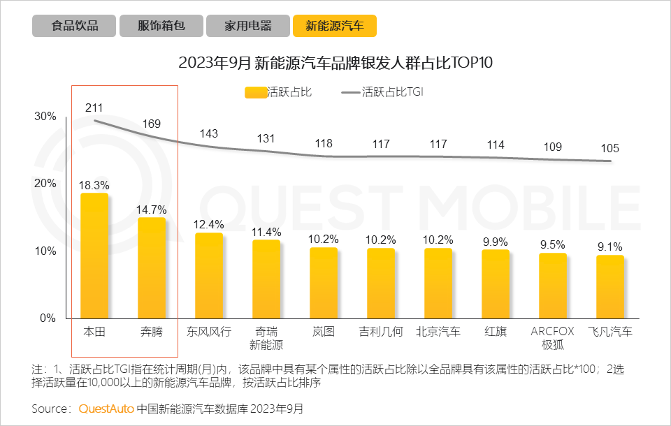 8、具體品牌上,本田、奔騰等品牌的新能源汽車受到銀發人群的明顯偏好,鮮有新勢力車企;新能源車企可深入關注銀發人群用車需求,拓展目標用戶圈層,豐富市場增量來源。