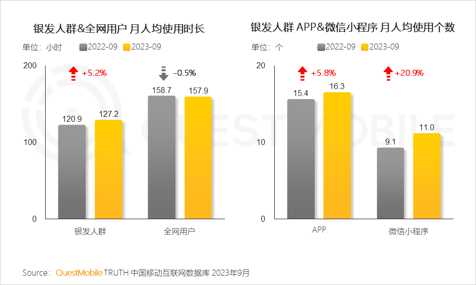 2、銀發人群加速融入數字時代,APP與微信小程序使用個數齊增長,相比于全網用戶,銀發用戶觸網時長仍保持上升態勢,漲勢亮眼。