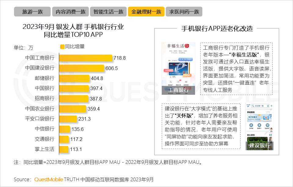 9、移動支付方面,各大國有及股份制銀行加快完成適老化進程,各手機銀行APP紛紛開發出適合老年群體的專屬界面,為銀發人群辦理金融業務提供更好的體驗,進而進一步獲得用戶擁躉。
