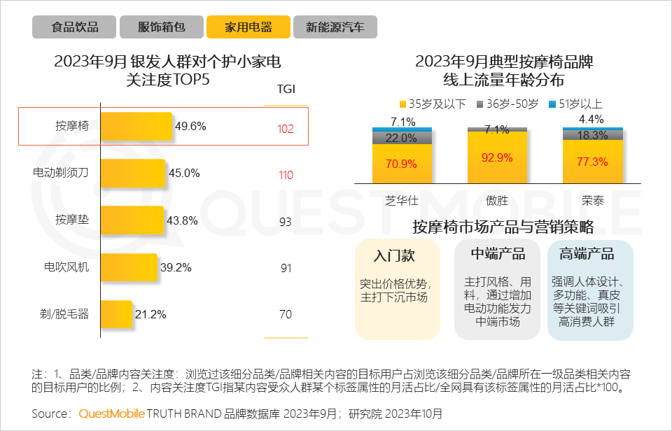 5、個護小家電獲得的銀發關注緊隨其后,細分表現在對按摩椅關注度更高;商品推廣策略需要突出“為父母消費”,這源于典型品牌的線上關注人群以35歲以下的中青年用戶為主。
