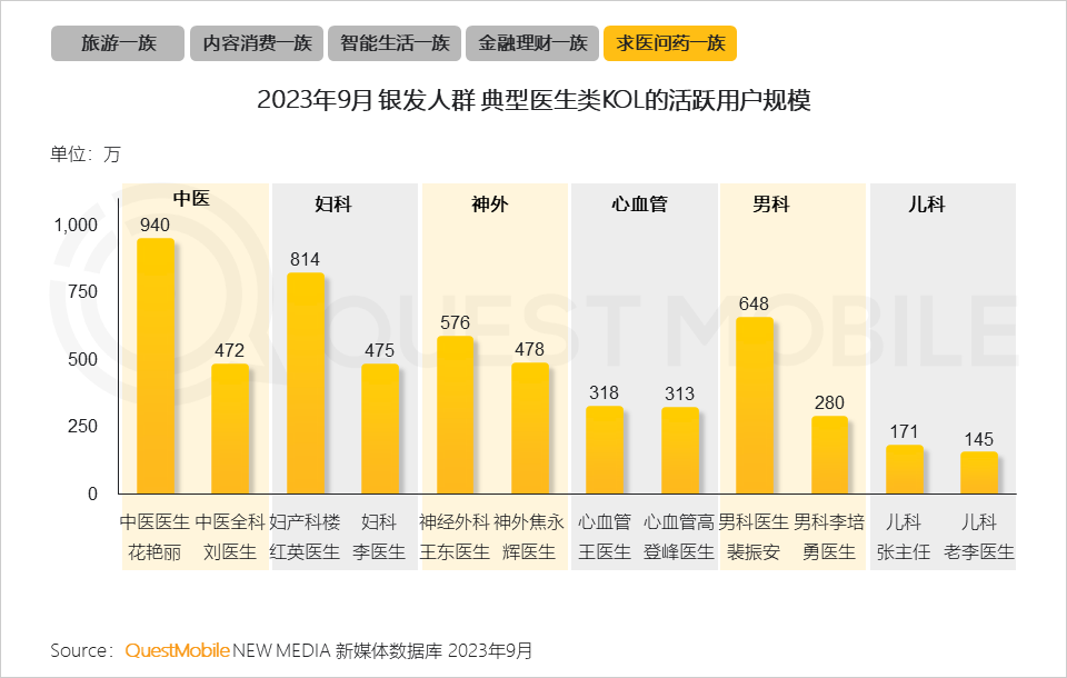 4、除了對醫療服務應用的使用,銀發人群也會選擇通過內容平臺的KOL來獲取廣泛的??漆t療保健內容。