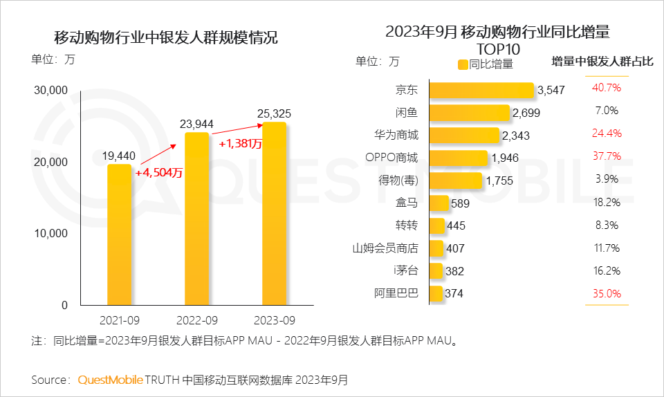2、近一年以來在線上購物領域,銀發人群對行業的使用規模增量超千萬,并為京東、華為商城、OPPO商城以及阿里巴巴等購物平臺提供2成以上的增量占比。