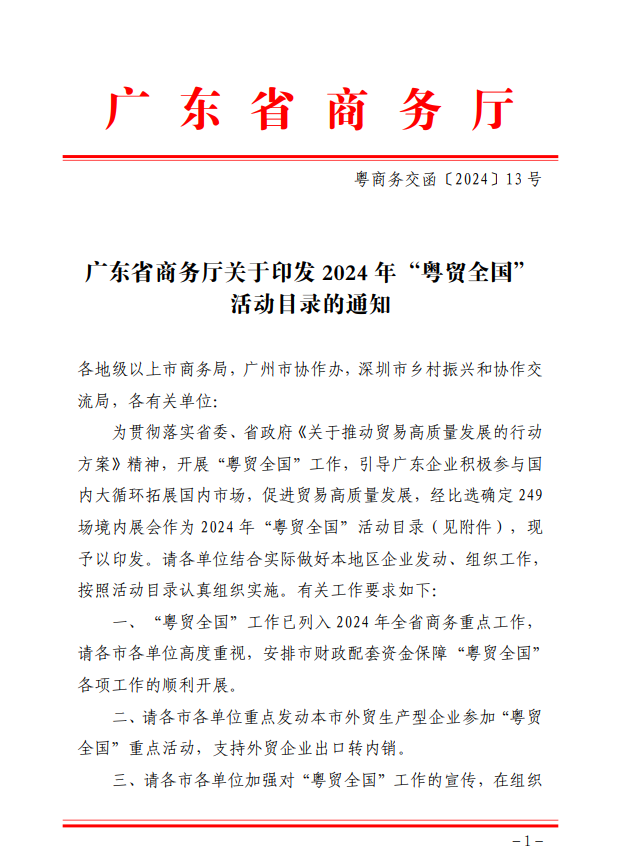 “粵貿全國”活動是貫徹落實黨中央、國務院關于推進貿易高質量發展指導意見的一個具體措施,為進一步貫徹落實廣東省委、省政府《關于推動貿易高質量發展的行動方案》。入圍展會將列入2024年全省商務重點工作,并優先獲得政府相關政策扶持。