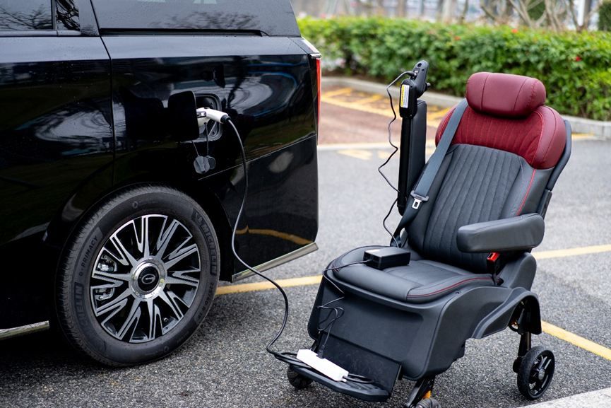 相比于2021年推出的M8福祉版,E9電動福祉版最大的特點在于——可分離式的福祉座椅,座椅直接就能“下地跑”,直接變成電動輪椅使用。
