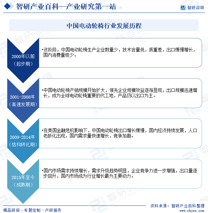 中國電動輪椅行業發展主要經歷了四個階段。2000年以前的起步期,中國電動輪椅生產企業數量少,技術含量低,質量差,出口緩慢增長,國內消費量極少。2001-2008年的高速發展期,中國電動輪椅產銷規模開始擴大,領先企業規模效益逐漸顯現,出口規模迅速增長,成為全球電動輪椅重要的代工地,產品仍以出口為主。2009年至2014年的結構轉化期,在美國金融危機影響下,中國電動輪椅出口增長緩慢,國內經濟持續發展,人口老齡化出現,國內需求量快速增長,競爭加劇。2015年至今的成熟期,國內市場需求持續增長,需求升級趨勢明顯,企業競爭力進一步增強,出口量逐步回升,國內市場成為行業增長最為主要動力。