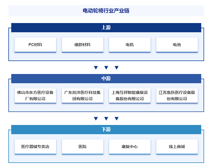 電動輪椅產業鏈上游為PC材料、橡膠材料、鋁合金、電機、電池、控制器、傳感器等。產業鏈中游為電動輪椅的生產制造商。產業鏈下游為醫療器械專賣店、醫院、康復中心、線上商城等。終端用戶包括老年人、殘疾人、傷病恢復者等需要輔助移動的群體。