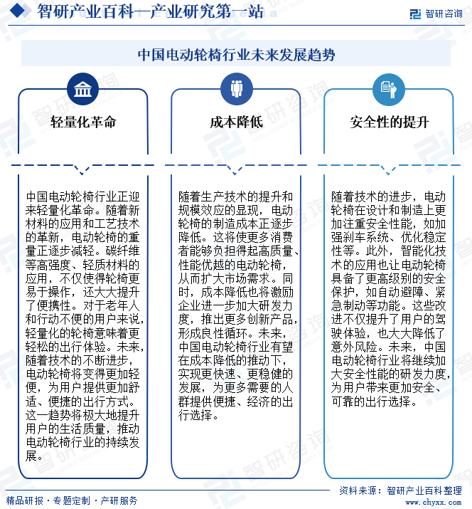 隨著中國人口老齡化的逐漸加劇,對電動輪椅等康復輔助器具的需求持續增長。國家通過相關政策推動康復醫療與康復輔助器具配置服務的銜接融合,為電動輪椅等產品的市場需求提供了有力保障。2024年1月,國務院印發《關于發展銀發經濟增進老年人福祉的意見》,提出大力發展康復輔助器具產業。推動助聽器、矯形器、拐杖、假肢等傳統功能代償類康復輔助器具升級,發展智能輪椅、移位機、康復護理床等生活照護產品。在政策推動下,電動輪椅行業將加快技術創新和產品升級。隨著政策的推動和市場需求的增長,電動輪椅行業將逐漸實現標準化和規范化發展。這將有助于提升產品的質量和安全性,降低生產成本和售價,進一步促進市場的擴大和普及。