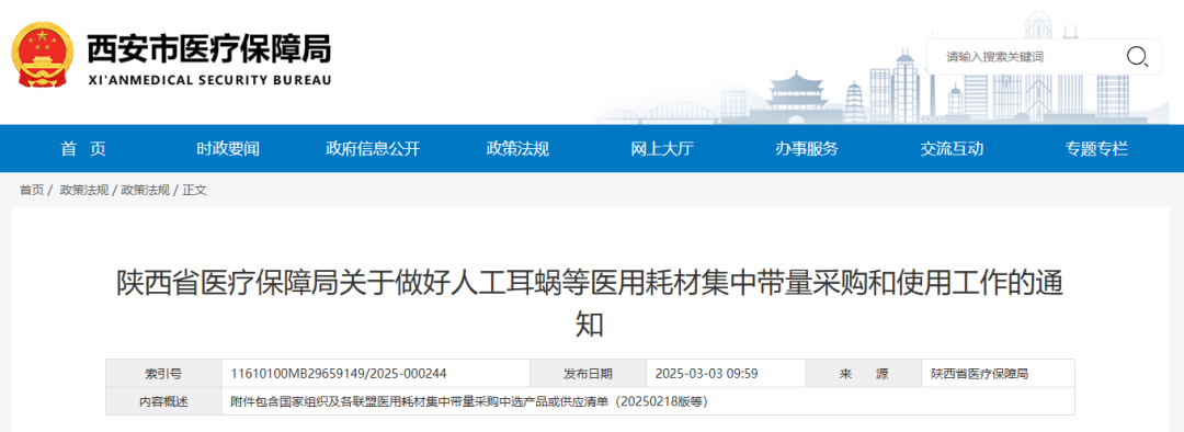 3月3日,陜西省醫療保障局發布《關于做好人工耳蝸等醫用耗材集中帶量采購和使用工作的通知》,其中指出,自2025年3月31日起執行人工耳蝸、乳房旋切針、血管組織閉合用結扎夾、導引導管和導引導絲、預充式導管沖洗器等醫用耗材集中帶量采購中選結果;自2025年5月1日起執行外周血管支架集采中選結果。其中人工耳蝸、外周血管支架、乳房旋切針采購周期3年,血管組織閉合用結扎來、導引導管和導引導絲接續采購周期2年,預充式導管沖洗器采購周期1年。