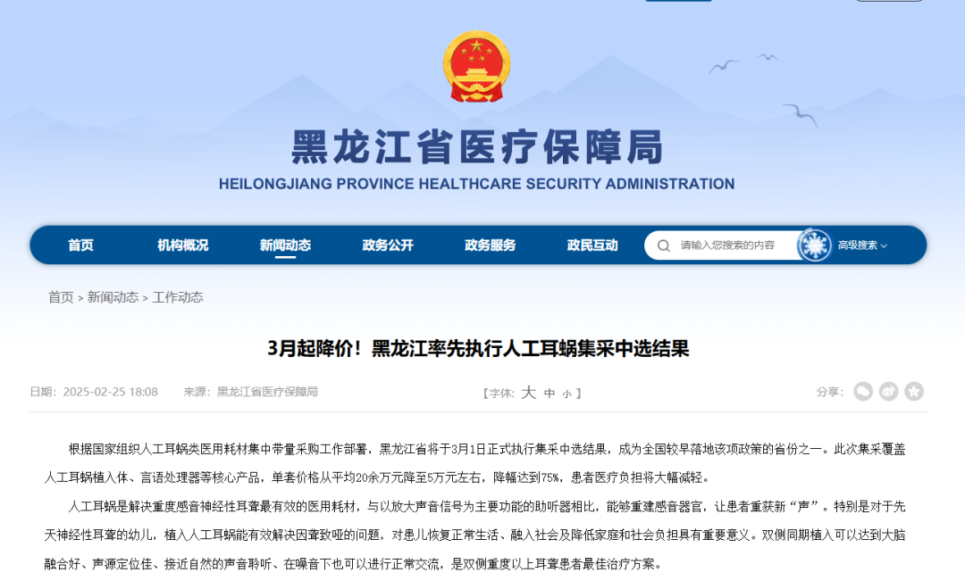 根據國家組織人工耳蝸類醫用耗材集中帶量采購工作部署,黑龍江省于3月1日正式執行集采中選結果,成為全國較早落地該項政策的省份之一。此次集采覆蓋人工耳蝸植入體、言語處理器等核心產品,單套價格從平均20余萬元降至5萬元左右,降幅達到75%,患者醫療負擔將大幅減輕。