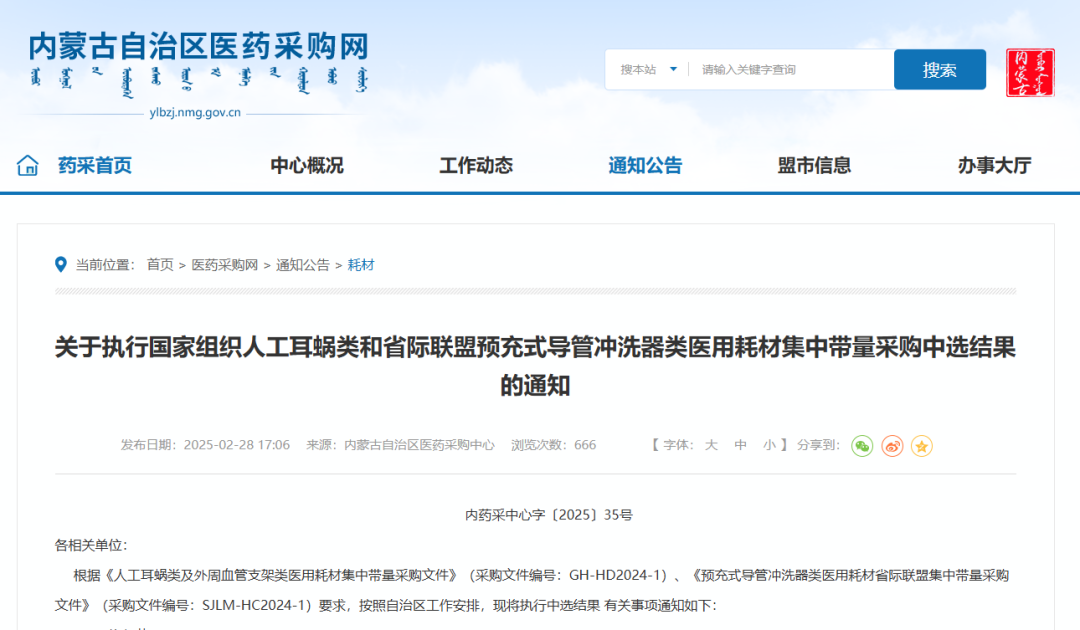 2月28日,內蒙自治區醫藥采購中心發布《關于執行國家組織人工耳蝸類和省際聯盟預充式導管沖洗器類醫用耗材集中帶量采購中選結果的通知》,其中指出,本次人工耳蝸類、預充式導管沖洗器類醫用耗材中選結果3月15日起正式執行,集中帶量采購的采購周期分別為3年、1年。