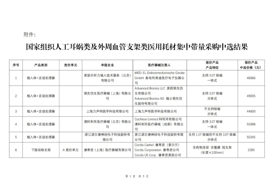 其中,人工耳蝸類集采中選結果自3月1日起執行,外周血管支架類集采中選結果自5月1日起執行,兩類耗材采購周期均為3年。