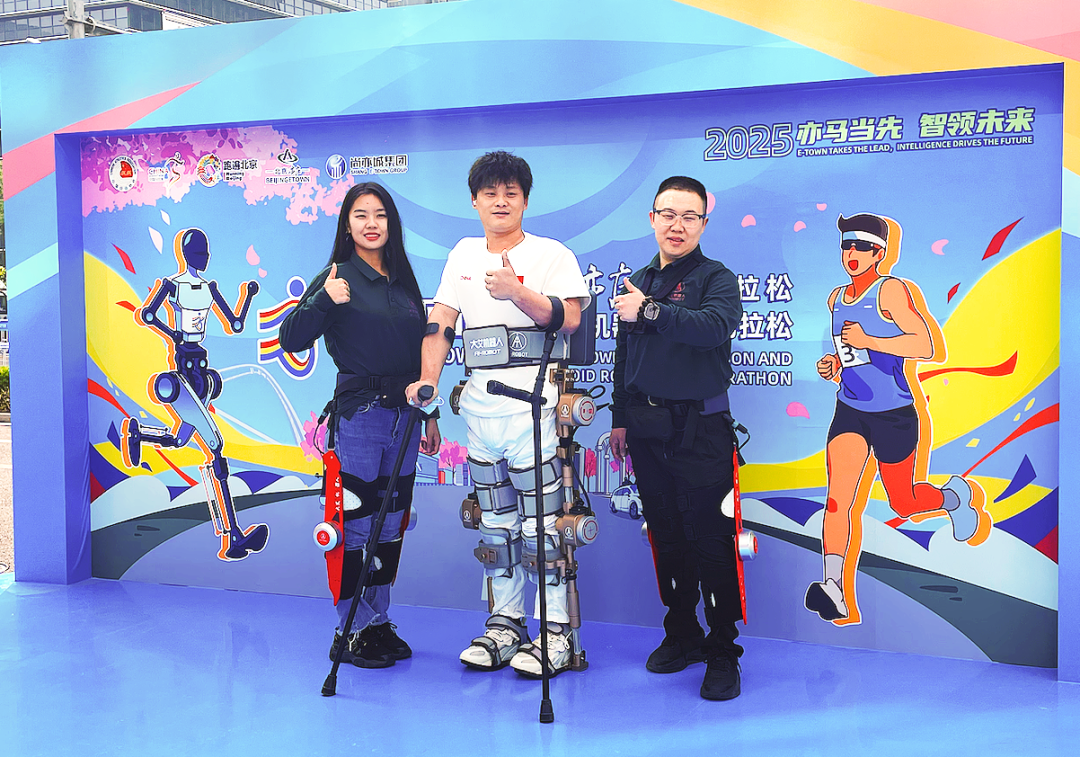 例如在2017年因高空墜落而導致截癱的邵海朋,便穿戴著大艾研發的外骨骼機器人完成了一場全程馬拉松,并打破了世界記錄。2025年4月19日,邵海朋也穿戴著艾動外骨骼機器人來到了全球首屆“人機共跑”半馬的現場,并以站立的姿態為參賽選手加油。