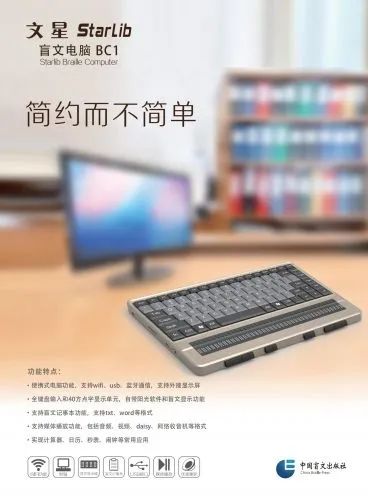 文星盲文電腦則搭配了點顯器,可以通過盲文觸點的自動升降“顯示”40萬盲文點字,自帶陽光軟件和盲文顯示功能。同時該產品也支持媒體播放功能,包括音頻、視頻等格式,可幫助視障人士提高獲取文化服務的便利性。