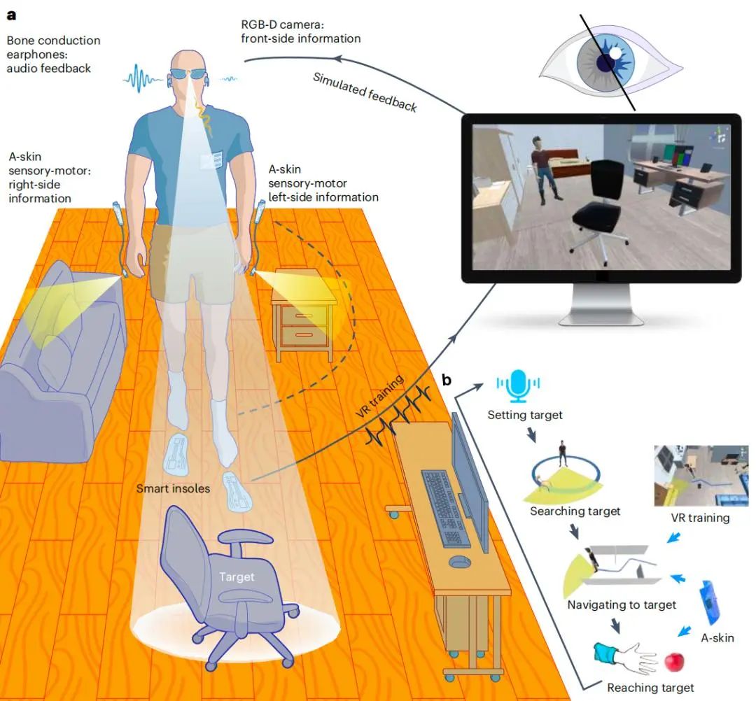 近日,上海交通大學顧磊磊副教授團隊聯合復旦大學、香港科技大學、華東師范大學等研發了一款融合AI和柔性電子的多模態可穿戴助盲系統。該系統整合視覺、聽覺和觸覺,以AI算法驅動進行環境監測,在穿戴者接近障礙物或物體時會通過骨傳導耳機進行語音提示,向其發送信號。而貼在手腕的可伸展柔性電子皮膚則能有效探測障礙物,并進行震動提醒,以此提升佩戴者的周邊環境感知能力,從而實現移動、抓取等視覺任務,能有效輔助視障人群出行。