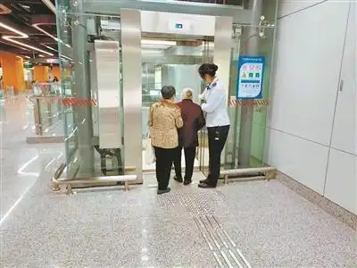 地鐵站內,一位工作人員正在引導老年人坐電梯。