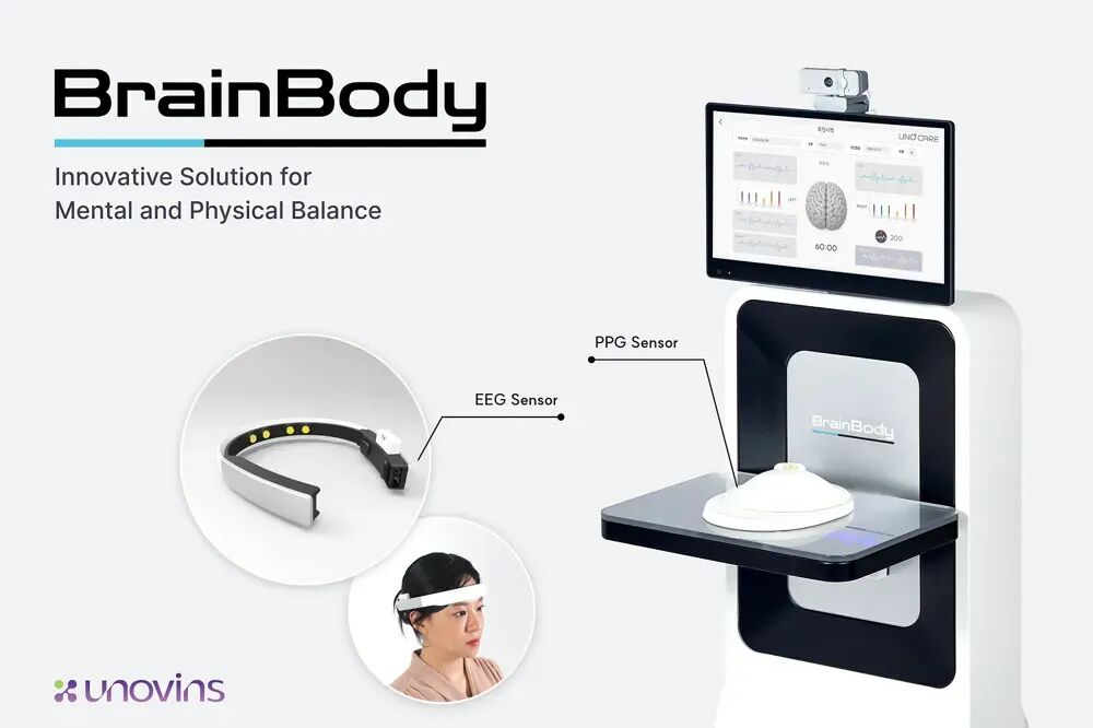 UNO BrainBody 是一款創新的一體化身心篩查系統,集成了雙通道腦電圖與穹頂型光電容積描記傳感器,能夠在一分鐘內同步完成腦電活動、心率變異性、軀體壓力與活力值等醫院級指標的快速評估,其篩查項目兼容韓國三項醫保報銷編碼,實現了高效、標準化的身心綜合檢測。設備配備面部識別登錄、平板操作界面及云端管理平臺,檢測結果可通過專屬應用“UNOCARE”查看歷史記錄并獲取個性化康復建議。未來還將引入AI解讀、個性化方案及新生物標志物開發,目前已應用于韓國多家精神科、內科及家庭診所。
