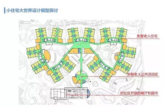 針對不同類型的老人,需要有不同的設計策略,不能把不同類型的失智老人混在一起,禪修型的需要一個安靜的角落,而浪人型則需要足夠的活動空間。荷蘭對失智癥老人的心理特征、需求的研究已經形成了一套非常有特色的失智癥照護模式和設計模型,我們把這個模型叫做“小住宅,大世界”,老人們以6~8人為一個單元,共用一個大起居室。不同健康狀況的老人,活動范圍分為三個級別:病情重的只能在自己的單元里活動,狀況稍好的可以到別的單元里串門,級別最高的可以到達對外的公共餐廳和超市等區域,但不能走出養老院