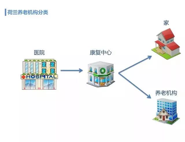 荷蘭法律規定,醫院的住院時間不允許超過6天。6天之后必須出院。一些老人因為中風或骨折等疾病從醫院出院后,會被安排在康復中心進行為期2~8周最長不超過6個月的治療,康復中心在治療后,根據老人的恢復情況,再決定安排他們回家休養,還是轉到養老護理機構。