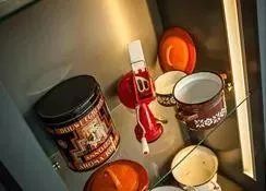 上圖是義工們用各種織物拼貼的一件陳設品,鍛煉老人的觸覺。下圖是養老院公共走廊里的一些康復訓練的設計。一些老物件的陳設,比如上圖的罐子,里面裝的東西類似于我們80年代的麥乳精,是老人們熟悉的物品。