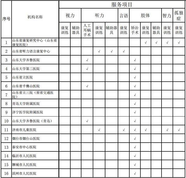 為貫徹落實《山東省人民政府關于建立殘疾兒童康復救助制度的通知》精神,日前,山東省、市、縣三級殘聯會同有關部門按照《關于印發山東省承擔殘疾人康復服務機構準入標準(試行)的通知》要求,結合實際需求,確定了承擔殘疾兒童康復救助任務的定點機構(第一批),并向社會公布公開,供廣大有需求殘疾兒童監護人選擇。